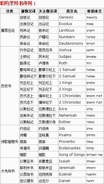 《旧约圣经》通常被分类为摩西五经(又称律法书,以色列人称为Torah Moshe,妥拉)、历史书、诗歌智慧书和先知书四部分。旧约圣经全在耶稣诞生之前已写成及被辑录成书,在基督教看来与耶稣诞生后成书的《新约圣经》相承。